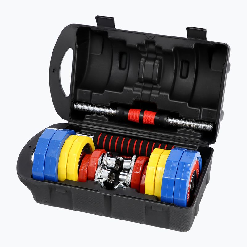 Компоненти комплекту 2х захватів, 4х затискачів, 1х з'єднання двох захватів, 4х пластин по 1,25 кг, 4х пластин по 2,5 кг, 4х пластин по 0,5 кг